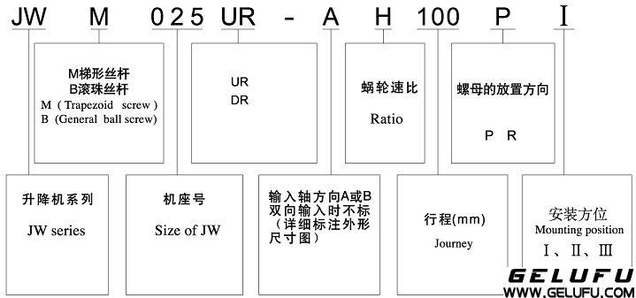 JWM螺旋升降机是一种基础起重部件,具有结构紧凑、体积小、重量轻、动力源广泛、无噪音、安装方便、使用灵活、功能多、配套形式多、可靠性高、使用寿命长等许多 点。可以单台或组合使用,能按一定程序准确地控制调整提升或推进的高度,可以用电动机或其它动力直接带动,也可以手动。它有不同的结构形式和装配形式,且提升高度可按用户的要求定制。 JW丝杆升降机概述: JWM型(梯形丝杆型) 低速、低频率 1.1 JWM型(梯形丝杆型)适用于低速、低频率的场合,主要构成部件为:精密梯形丝杆副与高精度蜗轮蜗杆副。 1.1.1经济: 结构紧凑、操作简单、保养方便。 1.1.2速、低频率: 主要用于负荷大、低速与无频繁工作的场所。 1.1.3保持载重:梯形丝杆具有自动工锁定功能,即使没有制动装置也可保持载重。 *在受到较大振动,冲击载荷时,偶尔会使自锁功能失灵,此时则须外加制动装置。 1.2 JWB型(普通滚珠丝杆型) 高速 高频率 JWB型(普通滚珠丝杆型),适用于高速,高频率和高性能的装置中,主要构成部件为精密滚珠丝杆副与 高精度蜗轮蜗杆副。 1.2.1 效率高:用滚动摩擦、提高了整机效率,只须很小的驱动源,就可以产生很大的推动力。 1.2.2 高速化:与梯形丝杆相比,速度有很大的提高,能轻松而高速的运转。 1.2.3 使用寿命长:采用高质量的滚珠丝杆,使其工作寿命提高3倍以上。 注:(1)本身无自锁功能,需外加加制动装置或选择带有制动的驱动源。 (2)JWH大螺距滚珠丝杆型另咨询。 1.3 机器装配形状、特点: 基本形式(UM,DS) 螺母转动丝杆上下移动,此为普通型升降机装配 US:押上 DS:吊下 *请根据载荷方向、安装方向来选择合适的升降机(押上或吊下) *丝杆轴在升降时,会产生旋转力,所以必须做好防止旋转措施。 止旋构造(UM,DM) UM:押上 DM:吊下 适用于顶端无连接下运转或因滑轮而卷拉着绳索等又不能实现防止旋转的情况 请根据载荷方向、安装方向来选合适的升降机(UM 或DM) 活动螺母构造(UR,DR) 一般情况下,升降机必须具有因丝杆轴的升降而产生的行程和丝杆罩所需的空间,若想在有限的空 间内增长行程时,使用此活动螺母构造非常适应(丝杆轴旋转,活动螺母移动)。丝杆轴顶端为圆柱形 ,所以在长行程时,在轴端采用支撑方式,可以得到很好的传动效果。 UR:押上 DR:吊下 请根据载荷方向,安装方向来选择合适的长降机(押上或吊下) 注:选型和型号表示方法中,还需注明螺母的放置方向。 动机或 其他动力直接带动,也可以手动。它有不同的结构形式和装配形式,且提升高度可按用户的要求定制。 。该装置可以自锁。 |