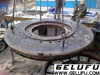 减速机回装是拆除的反工序,遵循先出后进的规律,回装时必须细心,不得遗忘任何部件,尤其是油管,回装时必须绘制各部件的结构图,按图逐项落实。回装中 困难的是三联齿轮系的安装,因为一方面三个齿轮内部要与下面的传动齿轮轴同时啮合,另一方面三个齿轮必须与大齿圈同时啮合,而下面的齿轮轴有一定的活动间隙,所以安装时必须放慢速度,必须使齿轮系保持水平,同时上下都有人时时查看,及时纠偏。