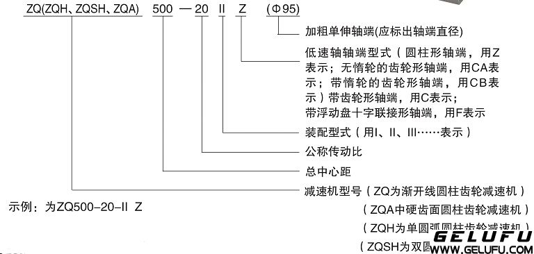 ZQ型减速机有两级传动,装配型式共有九种,输入轴伸为圆锥形,输出轴端由圆柱形(Z型)、齿轮型(CA型、C型)一级欧氏(十字滑块)联轴器(F型)。