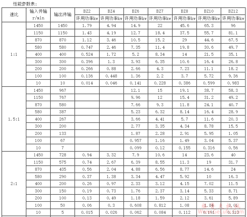 BZ系列螺旋锥齿轮转向箱输入功率、许用转矩及减速机重量