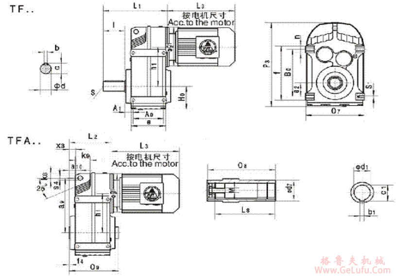 TF38、TFA38、TF48、TFA48、TF58、TFA58、TF68、TFA68、TF78、TFA78、TF88、TFA88、TF98、TFA98、TF108、TFA108、TF128、TFA128、TF158、TFA158、系列平行轴斜齿轮减速机的安装尺寸