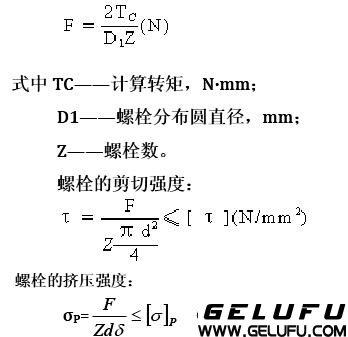 [T]——螺栓材料的許用剪應力,載荷穩定時,可取[T]=0.4σS,載荷變化時,可取[T]=(0.2~0.25)σS,σS為螺栓材料的屈服極限; [σ]P——許用擠壓應力,N/mm2,載荷穩定時,對鋼可取[σ]P=(0.8~1)σS,對鑄鐵可取[σ]P=0.8[σ]b;載荷變化時,對鋼可取[σ]P=(0.5~0.65)[σ]S;對鑄鐵可取[σ]P=0.5[σ]b,其中[σ]b為材料的拉伸強度極限。 普通螺栓聯接,裝配時須擰緊螺栓,靠兩半聯軸器端麵之間發生的摩擦力傳遞轉矩,每一螺栓的預緊力為: