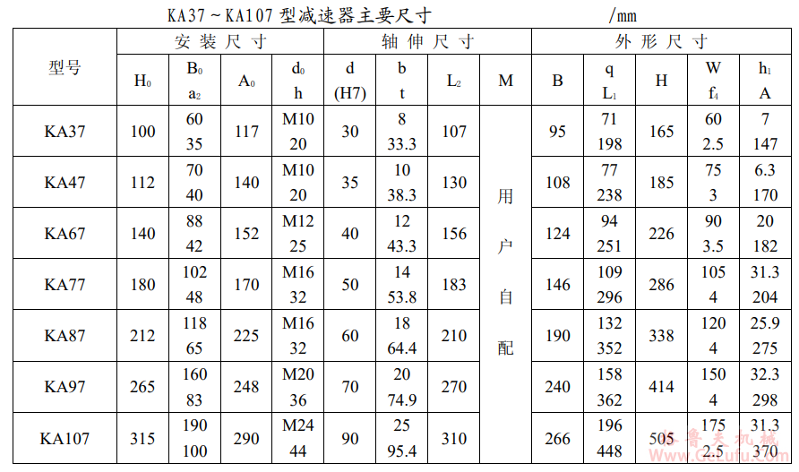 (2)KA37~KA107型減速機主要尺寸見下圖和表。