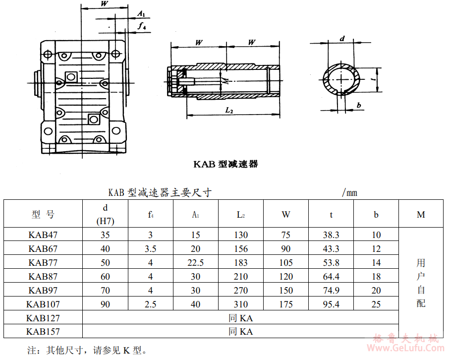 (3)KA127、KA157型減速機主要尺寸見下圖和表。