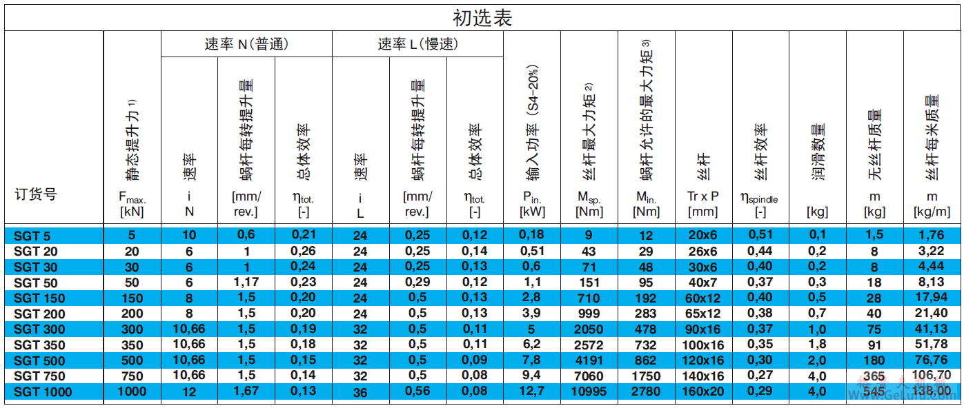 以上表格僅限於 標準配置的格魯夫SGT-螺旋升降機(油脂潤滑,絲杆直徑,絲杆長度…)和標準材料.也可提供油潤滑的特殊產品,會有更高的效率,這樣可以選用更小規格的螺旋升降機.各種應用數據是必須的以保證正確選擇.