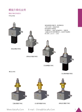 螺旋升降机应用 螺旋升降机种类图示 丝杠运动S型 独特球墨铸铁凹槽外壳,提高整体性能 专利方形尾罩,控制丝杠自转 绝对机械同步升降系统 安全螺母设计,监测产品的磨损状况,消除隐患 与减速电机和各式附件模块组合,满足客户任意要求 推力范围:500公斤 - 100吨 普通齿螺旋升降机 滚珠丝杠螺旋升降机 反齿隙螺旋升降机 螺母运动R型 安全螺母螺旋升降机 普通齿螺旋升降机 安全螺母螺旋升降机 滚珠丝杠螺旋升降机 Www.GeLuFu.Com E-mail:China@GeLuFu.Com 1