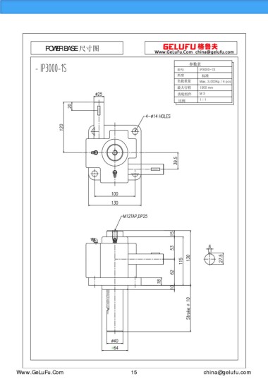 POWER BASE 尺寸图 参数表 型号 IP3000-1S 类型 标准 负载重量 Max. 3,000Kg / 4 pcs 最大行程 1500 mm 齿轮组件 M 3 比例 1 : 1 Www.GeLuFu.Com 15 china@gelufu.com
