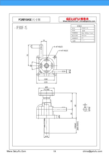 POWER BASE 尺寸图 参数表 型号 IP300F-1S 类型 标准 负载重量 Max. 300Kg / 4 pcs 最大行程 350 mm 齿轮组件 M 1 比例 1 : 1 Www.GeLuFu.Com 19 china@gelufu.com