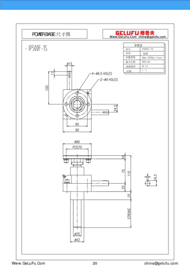 POWER BASE 尺寸图 参数表 型号 IP500F-1S 类型 标准 负载重量 Max. 500Kg / 4 pcs 最大行程 600 mm 齿轮组件 M 1.5 比例 1 : 1 Www.GeLuFu.Com 20 china@gelufu.com