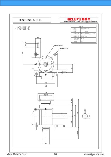 POWER BASE 尺寸图 参数表 型号 IP20000F-1S 类型 标准 负载重量 Max. 20,000Kg / 4 pcs 最大行程 2200 mm 齿轮组件 M 4 比例 1 : 1 Www.GeLuFu.Com 26 china@gelufu.com