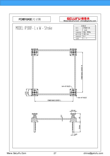 POWER BASE 尺寸图 参数表 型号 类型 标准 负载重量 最大行程 齿轮组件 比例 Www.GeLuFu.Com 27 china@gelufu.com