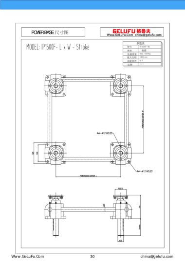 POWER BASE 尺寸图 参数表 型号 IP1500F-4S 类型 标准 负载重量 Max. 1500Kg 最大行程 1300 mm 齿轮组件 M 2 比例 1 : 1 Www.GeLuFu.Com 30 china@gelufu.com