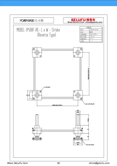 POWER BASE 尺寸图 参数表 型号 IP500F-4S-RE 类型 标准 负载重量 Max. 500Kg 最大行程 600 mm 齿轮组件 M 1.5 比例 1 : 1 Www.GeLuFu.Com 36 china@gelufu.com