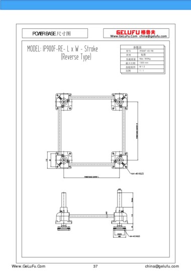 POWER BASE 尺寸图 参数表 型号 IP900F-4S-RE 类型 标准 负载重量 Max. 900Kg 最大行程 1300 mm 齿轮组件 M 1.5 比例 1 : 1 Www.GeLuFu.Com 37 china@gelufu.com