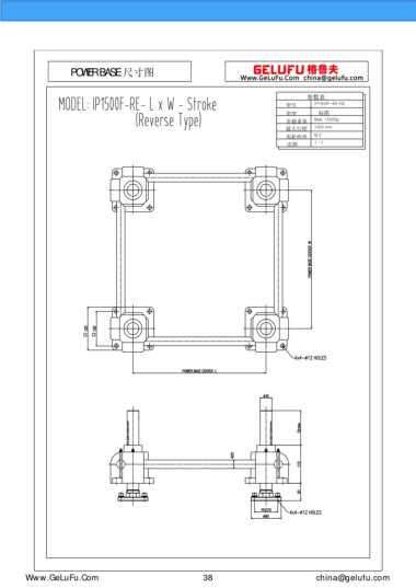 POWER BASE 尺寸图 参数表 型号 IP1500F-4S-RE 类型 标准 负载重量 Max. 1500Kg 最大行程 1300 mm 齿轮组件 M 2 比例 1 : 1 Www.GeLuFu.Com 38 china@gelufu.com