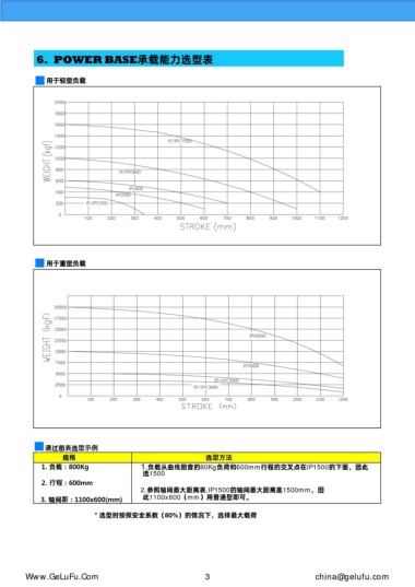 1. 负载 : 800Kg 1.负载从曲线图查的80Kg负荷和600mm行程的交叉点在IP1500的下面,因此