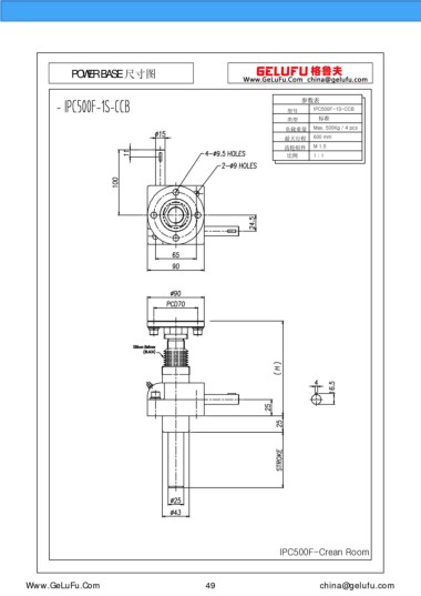 POWER BASE 尺寸图 参数表 型号 IPC500F-1S-CCB 类型 标准 负载重量 Max. 500Kg / 4 pcs 最大行程 600 mm 齿轮组件 M 1.5 比例 1 : 1 IPC500F-Crean Room Www.GeLuFu.Com 49 china@gelufu.com
