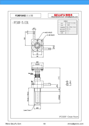 POWER BASE 尺寸图 参数表 型号 IPC500F-1S-CCBL 类型 标准 负载重量 Max. 500Kg / 4 pcs 最大行程 600 mm 齿轮组件 M 1.5 比例 1 : 1 IPC500F-Crean Room Www.GeLuFu.Com 50 china@gelufu.com