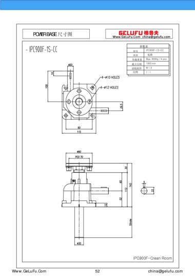 POWER BASE 尺寸图 参数表 IPC900F-1S-CC 型号 类型 标准 负载重量 Max. 900Kg / 4 pcs 最大行程 1300 mm 齿轮组件 M 1.5 比例 1 : 1 IPC900F-Crean Room Www.GeLuFu.Com 52 china@gelufu.com