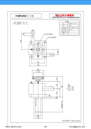 POWER BASE 尺寸图 参数表 型号 IPC3000F-1S-CC 类型 标准 负载重量 Max. 3,000Kg / 4 pcs 最大行程 1500 mm 齿轮组件 M 3 比例 1 : 1 IPC3000F-Crean Room Www.GeLuFu.Com 60 china@gelufu.com