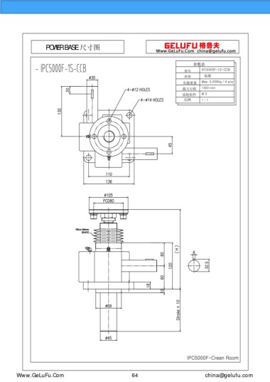 POWER BASE 尺寸图 参数表 型号 IPC5000F-1S-CCB 类型 标准 负载重量 Max. 5,000Kg / 4 pcs 最大行程 1500 mm 齿轮组件 M 3 比例 1 : 1 IPC5000F-Crean Room Www.GeLuFu.Com 64 china@gelufu.com
