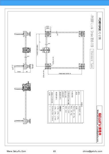 POWER BASE 尺寸图 标准 NMRV030 Www.GeLuFu.Com 比例 减速后升降举例 65 减速机速比 减速机型号 齿轮组件 最大行程 升降速度(1rev/mm) 负载重量 类型 型号 参数表 china@gelufu.com
