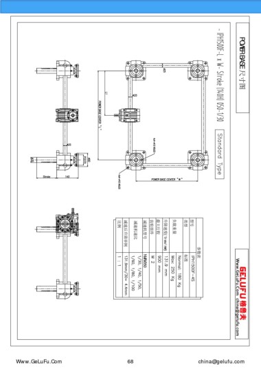 BASE 尺寸图 比例 减速后升降举例 减速机速比 减速机型号 齿轮组件 最大行程 升降速度(1rev/mm) 负载重量 类型 型号 参数表 POWER 标准 NMRV050 Www.GeLuFu.Com 68 china@gelufu.com